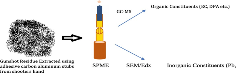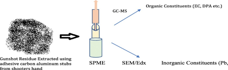 Figure 04: Gunshot residue analysis technique using solid-phase micro extraction. SPME, Solid-phase microextraction; EC, ethyl centralite; DPA, diphenyl amine