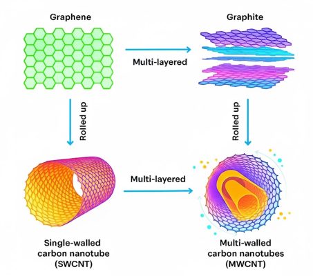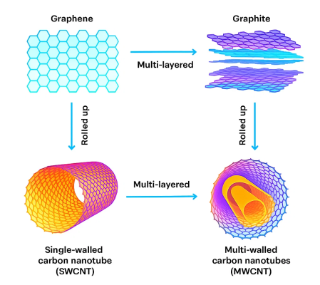 Fig: Structural relationship between graphene, graphite, single-walled and multi-walled carbon nanotubes visualized through schematic diagrams and 3D models.