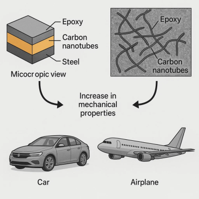 Fig: Schematic and microscopic views of CNT-steel reinforced composites showing layers of epoxy, and the effect of carbon nanotubes on mechanical properties.