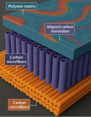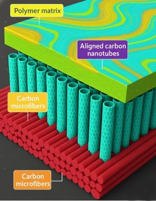 Fig: Structure of a layered composite showing aligned carbon nanotubes at ply interfaces reinforcing carbon microfibers in a polymer matrix.