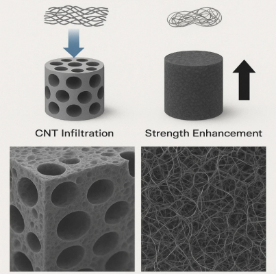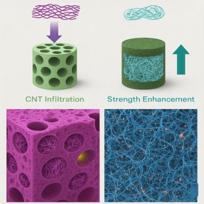 Fig: Visual representation of carbon nanotube reinforced composites showing the infiltration of CNTs into a porous template, bamboo lashing for strength enhancement, and detailed SEM images of the nanotube networks and joints.