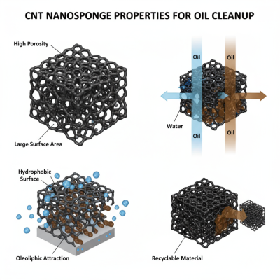 Carbon Nanotube (CNT) Nanosponges: These nanosponges are extremely lightweight but very strong. They have a high level of porosity and a large surface area, which allows them to soak up a huge amount of oil compared to their own weight. They are also chemically stable and can be reused many times without losing their efficiency. Example CNT–graphene composite sponges, CNT aerogel sponges.