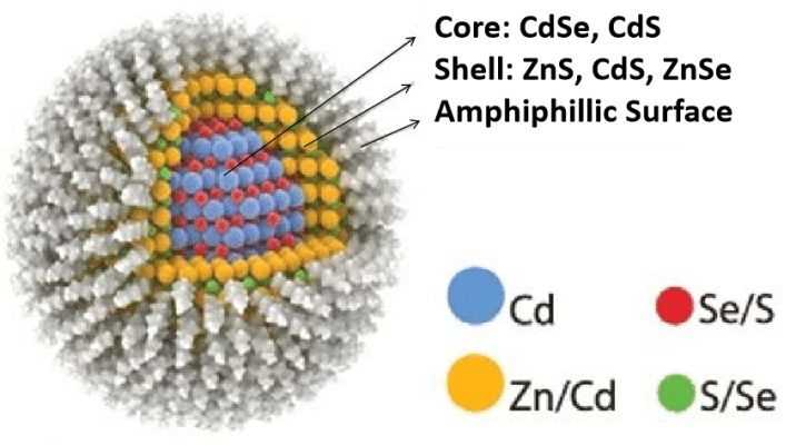 Consist of a core material surrounded by a shell of another semiconductor material. Shell material can modify the quantum dot’s optical properties and enhance stability.